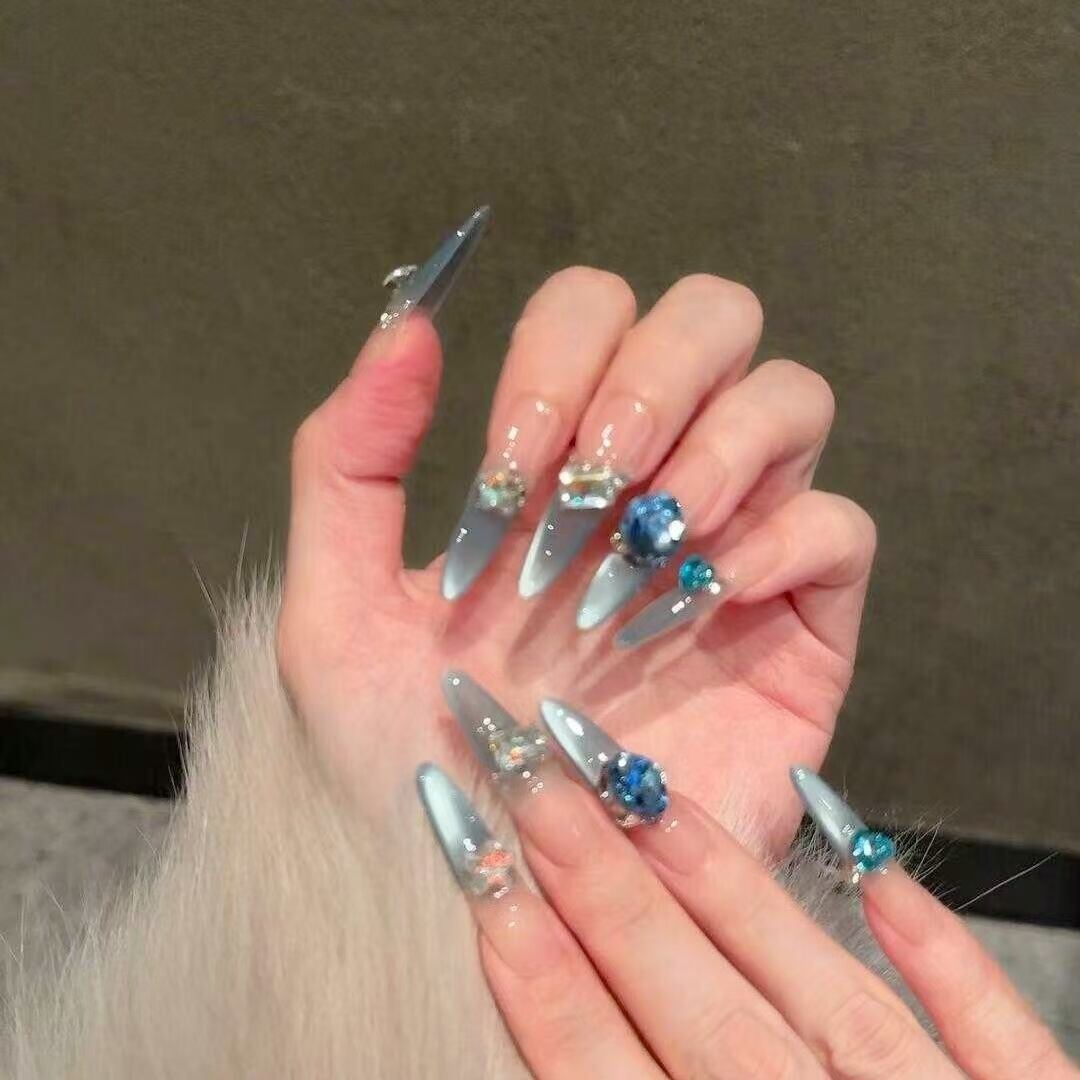 透明感あふれる♪淡ブルーグラデ キャッツアイネイルチップ 手作りつけ爪セット
