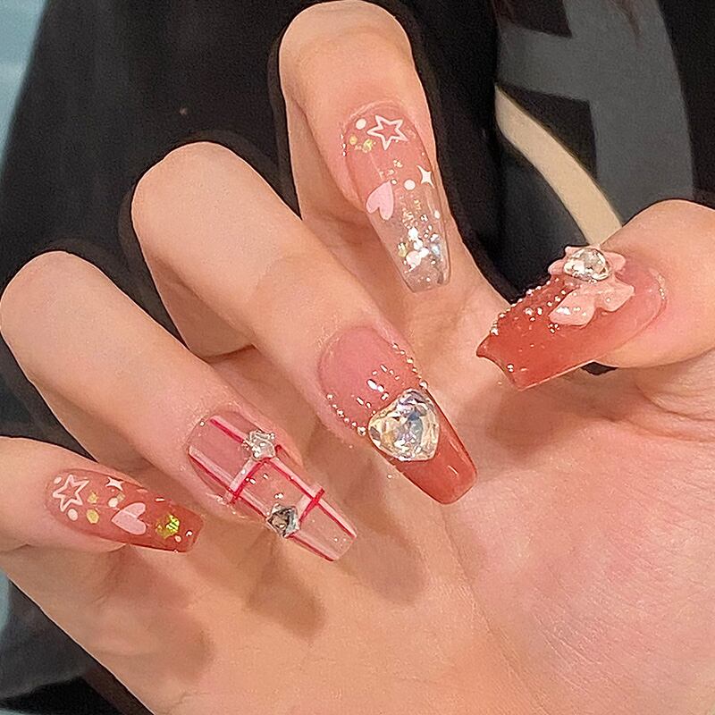 ドーパミンカラー 高級感 キュート系ハンドペイントハートネイルチップ つけ外し簡単なデザインネイル