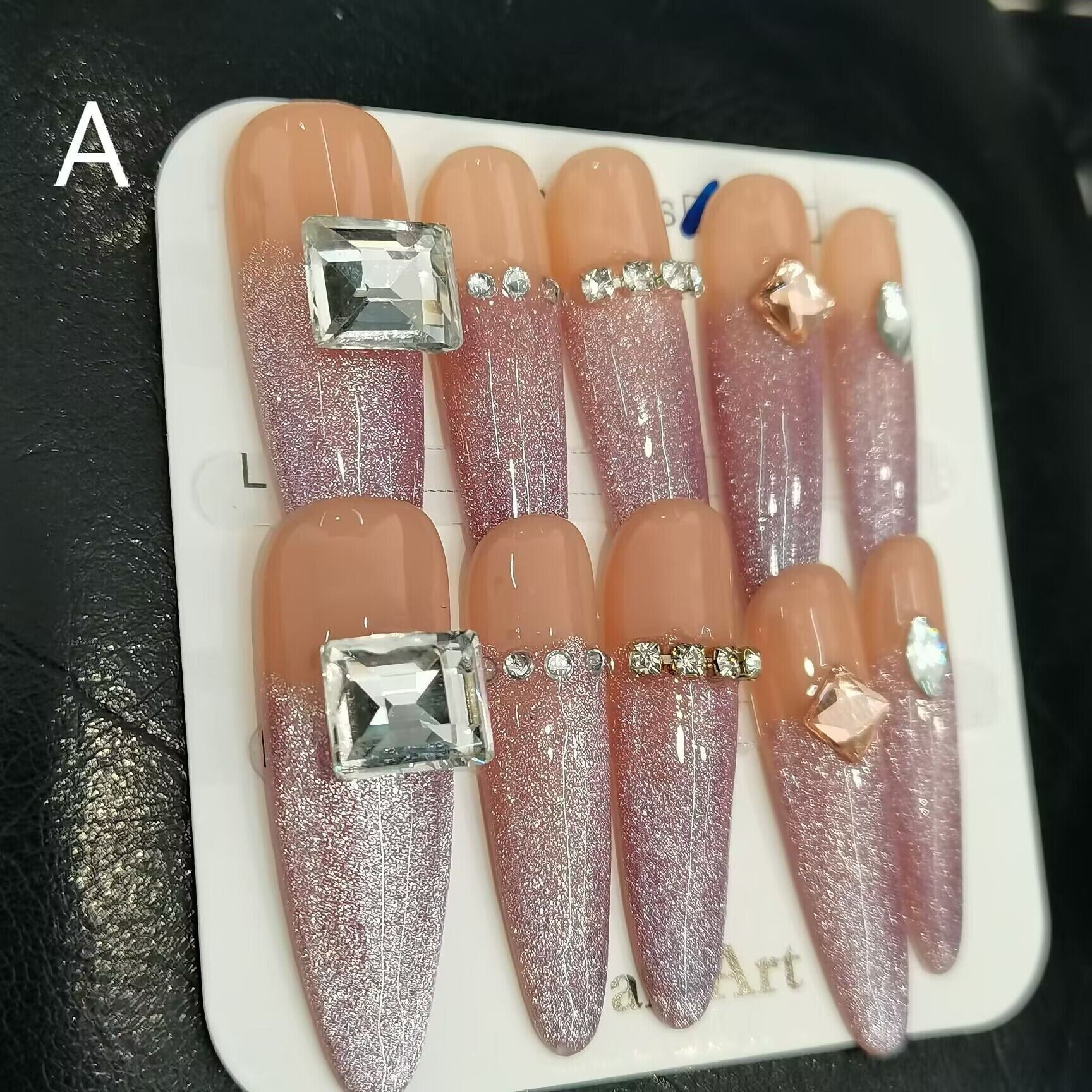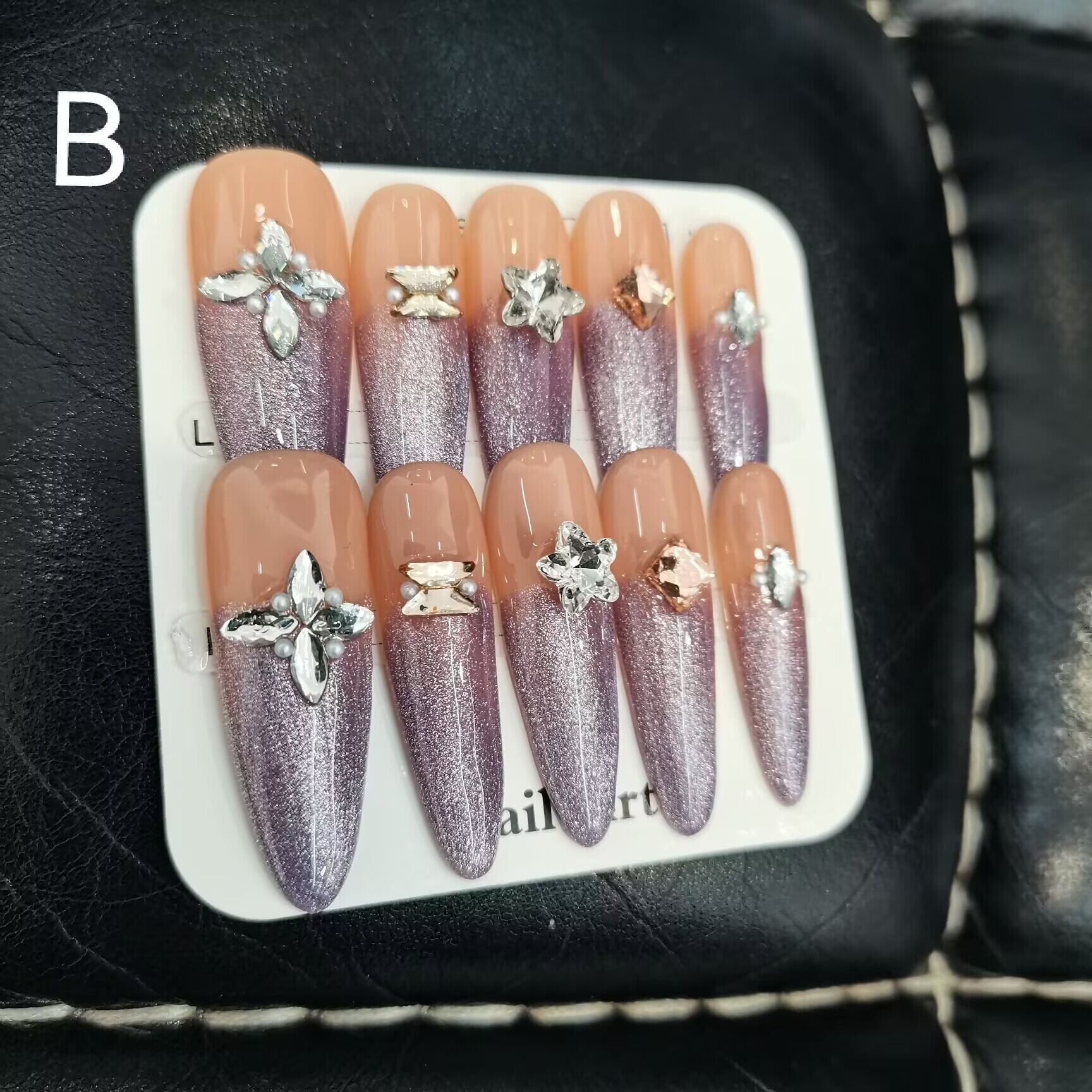 ♥在庫処分【60%OFF】大人可愛い 紫ラメ ロングネイル チップ ダイヤ付き つけ爪 上品 キラキラ ジェル風 ネイルチップ 韓国風 手作り ネイルアート